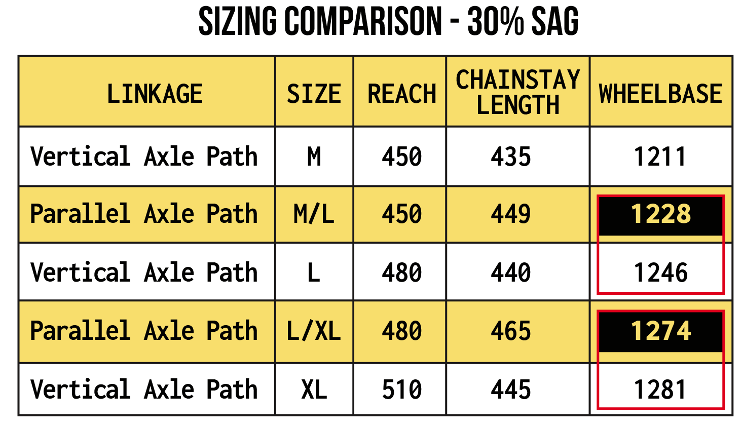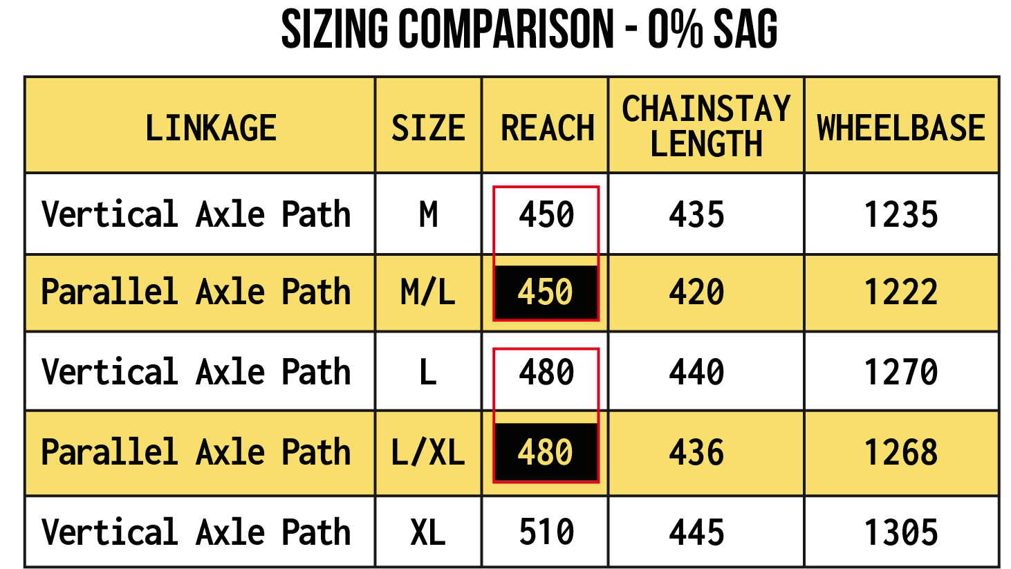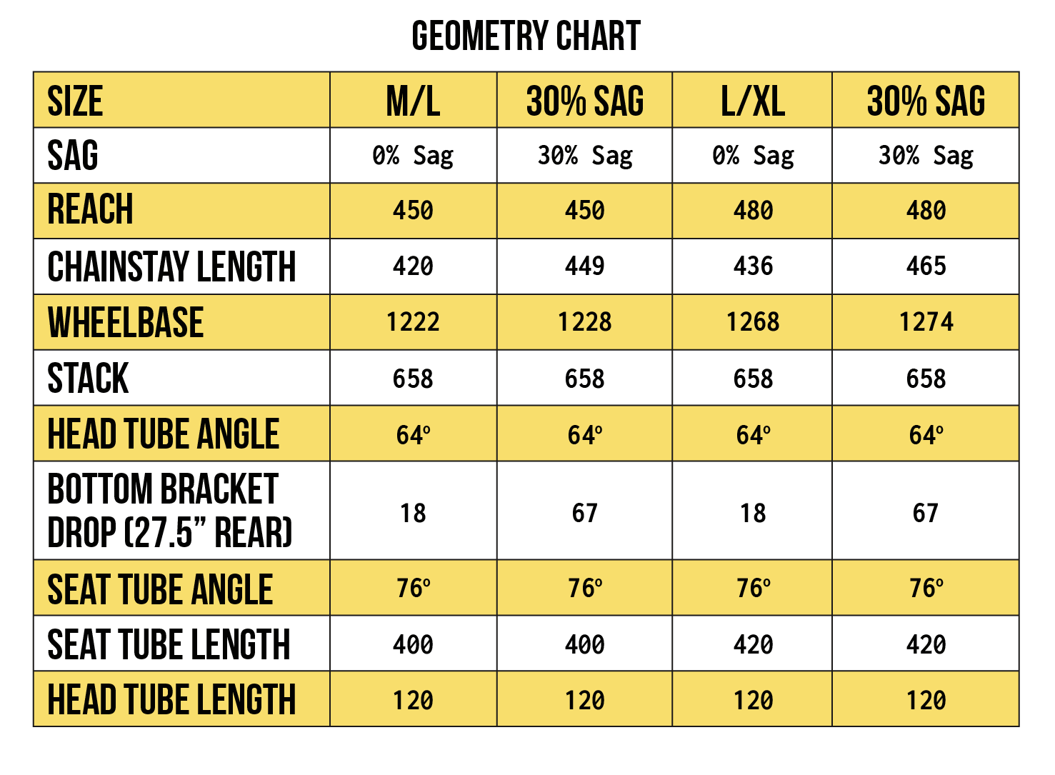We recommend going for a slightly shorter reach than you are used to and have included the wheelbase numbers at 30% sag so you can compare to your current bike. This will tell you how stable the bike will feel better than the reach number. For example, our M/L may have the reach of a typical medium, but it will be much more capable, as it has a wheelbase more similar to a large. Hence our in between sizing scheme. We recommend sizing based on your desired use- want fast and stable? Size up. Want flickable and fun? Size down.